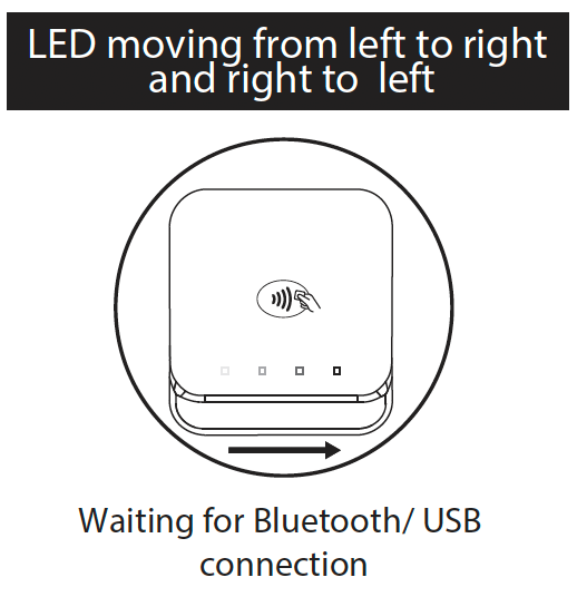 Users should see the reader's LED lights moving from left to right and right to left to indicate that it is powered on but not yet connected to your point of sale device. This LED pattern, which stops once a connection is made, ensures a consistent visual status for both Bluetooth and USB connections.